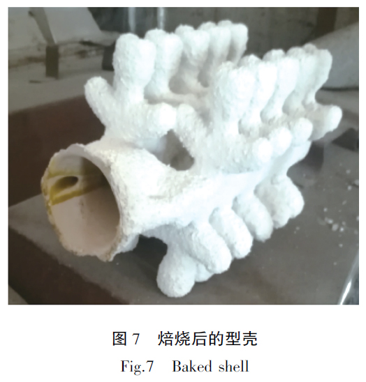 樹脂模在焙燒過程中容易發(fā)生膨脹脹裂型殼,本工藝樹脂模因其表面涂有蠟,預熱溫度60℃時蠟已經(jīng)開始融化,使模型與殼之間產(chǎn)生了間隙,徹底解決了因樹脂焙燒膨脹而對模殼產(chǎn)生的脹裂問題。樹脂模必須采用天然氣爐焙燒,樹脂在天然氣爐中瞬間燃燒消失減少了其因膨脹而對型殼損壞。圖6 為天然氣焙燒爐,圖7 為焙燒后的型殼。制好的的型殼組盤后即可澆注,澆注好的鑄件如果是重量輕、壁厚薄的鑄件其表面污染層薄,無需專門去除,經(jīng)過熱等靜壓、精整和包裝后即可發(fā)給客戶。